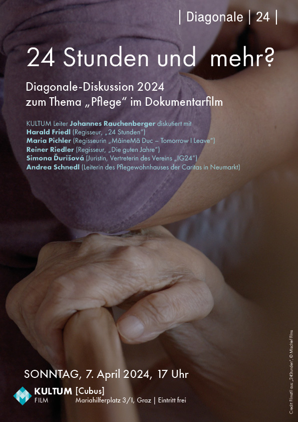 Das Diskurspanel der „Diagonale“ im KULTUM nimmt jährlich Themen auf, die sich jeweils aus den produzierten Filmen ergeben und gesellschaftliche, soziale und politische Brisanz aufweisen: Dieses Jahr ist es das Thema Pflege. Lange tabuisiert oder im öffentlichen Debattenfeld nicht existent, kann man „Pflege“ nicht länger nicht thematisieren. Fast alle, die davon betroffen sind, geben zu, für diesen „Ernstfall“ nicht vorbereitet gewesen zu sein. Psychische, aber auch physische Überforderung stellen sich rasch oder auch erst später ein, wer seine Angehörigen selbst zu Hause pflegt. Wer aber Hilfe holt, wird Teil eines Hierarchiegefälles, über das man gar nicht gerne spricht: Woher kommen die Menschen eigentlich, die meinen Vater, meine Mutter, meinen Partner oder Partnerin betreuen sollen, wenn sie allmählich oder auch plötzlich das Alltägliche nicht mehr schaffen? Wie kommt man zu ihnen? Wer soll helfen, bitte jetzt sofort und vor allen anderen mir?