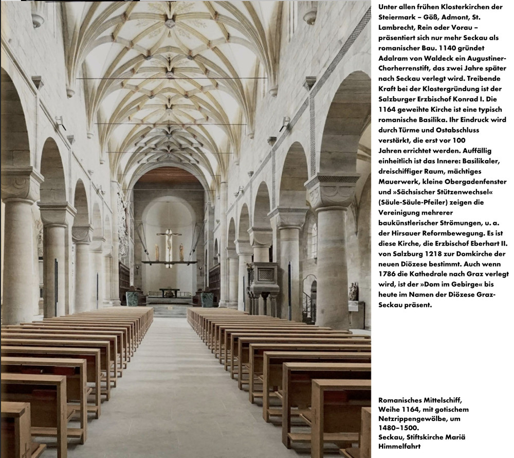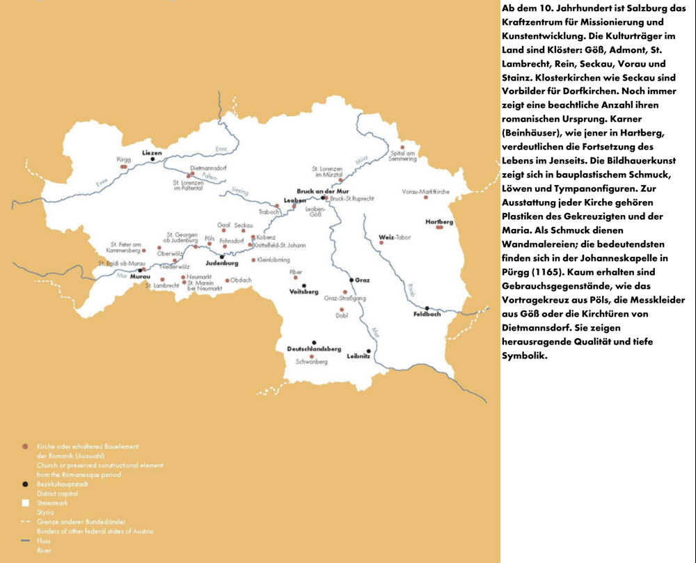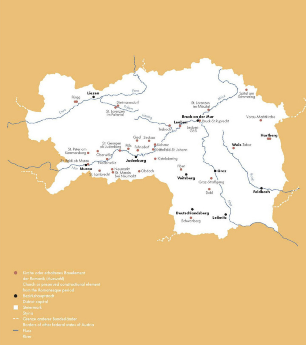 Seckau zeigt am deutlichsten den Eindruck einer romanischen Klosterkirche. Viele steirische Kirchen besitzen beeindruckende romanische Bauelemente: So haben sich »Dorfbasiliken« in Pöls, Hartberg, St. Lorenzen im Mürztal oder Spital am Semmering erhalten. Weit verbreitet sind Chorturmkirchen, wie in Weiz-Tabor, Piber, Oberwölz, Kobenz, Gaal, St. Georgen ob Judenburg, St. Ruprecht in Bruck an der Mur und Fohnsdorf. In Pürgg oder Dietmannsdorf sind Chorturmkirchen zu finden. Unter den Karnern ist jener in Hartberg der schönste.