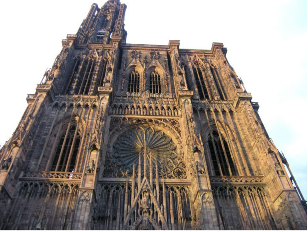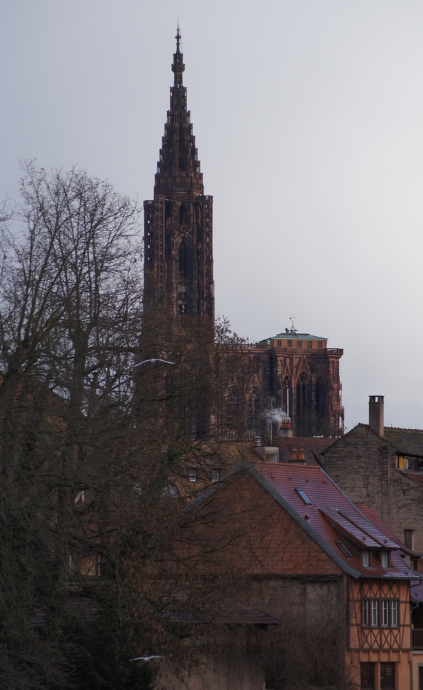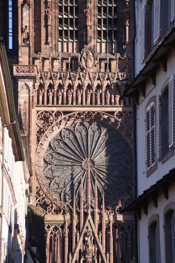 Straßburg: Unvermittelt tritt die monumentale Fassade aus der kleinteiligen Bebauung. Erst spätere Zeiten haben Freiflächen geschaffen, die den Abstand schufen um Gebäude dieser Größe in ihrer Gesamtheit wahrnehmen zu können.