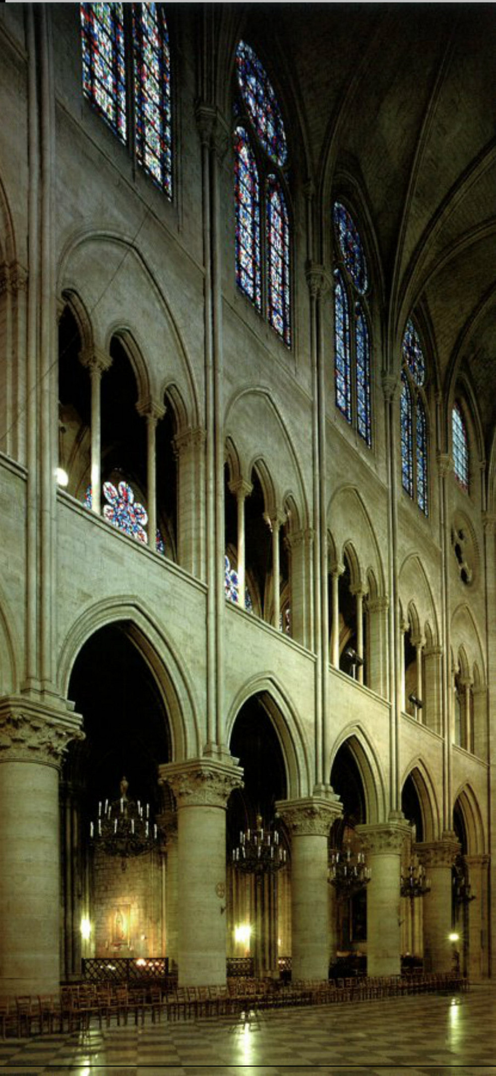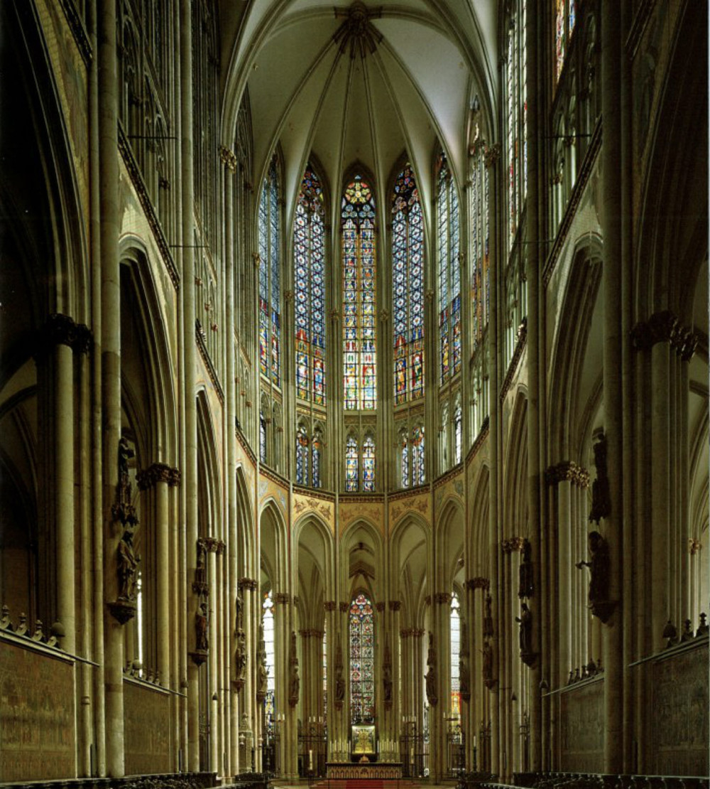 Hoher Dom zu Köln, Grundsteinlegung 1248, Einstellung der Arbeiten 1560, Vollendung im 19. Jh. Blick in Innenraum und Chor, der durch einen Umgang und sieben Kranzkapellen geschlossen wird.