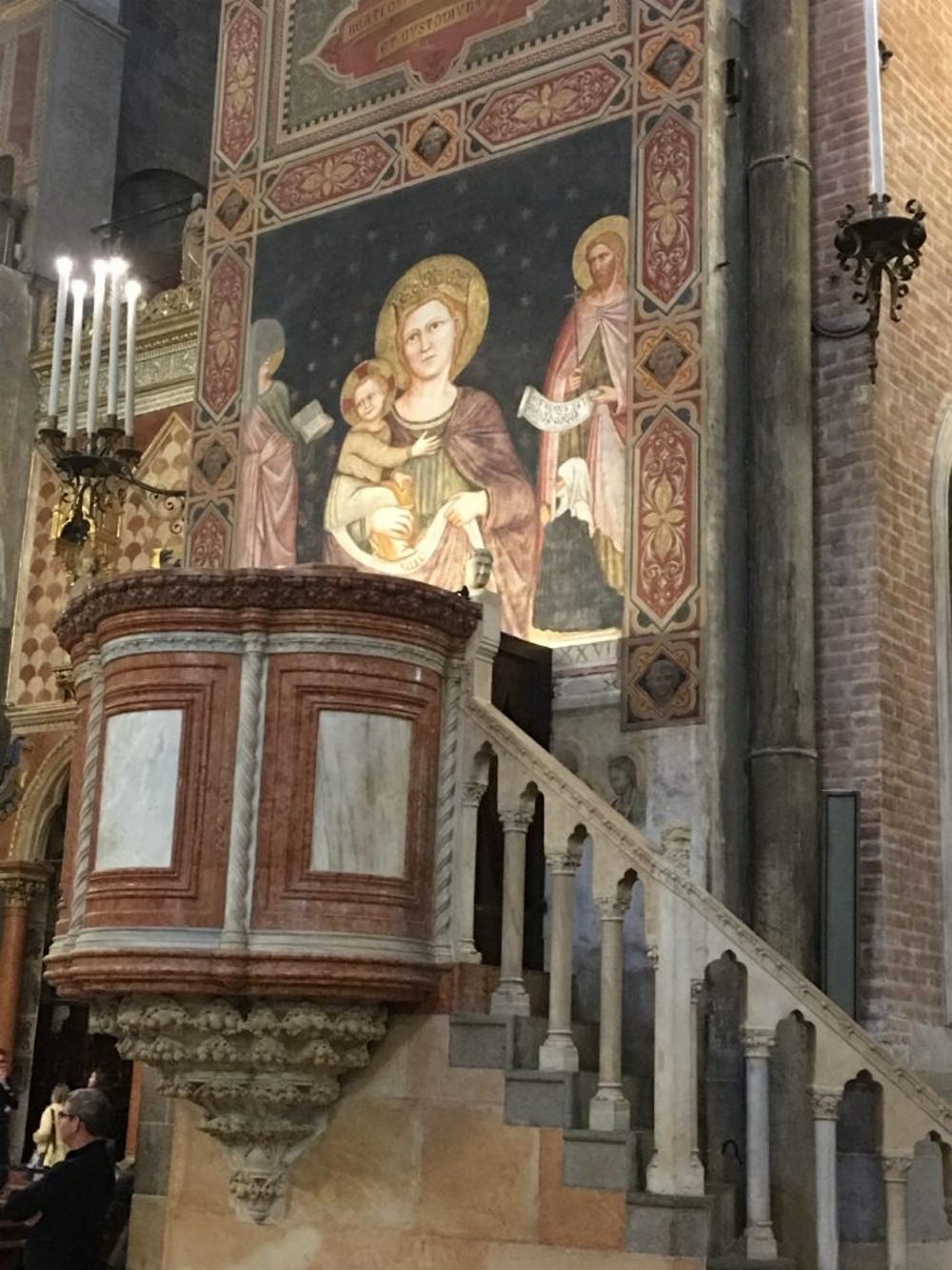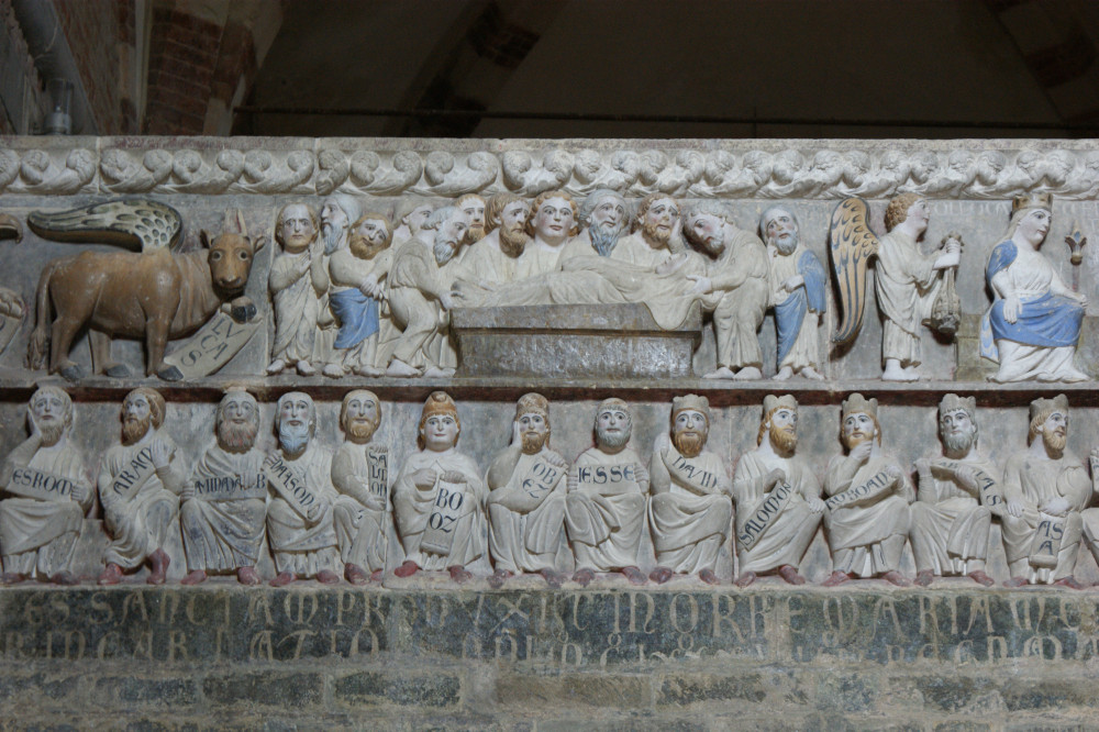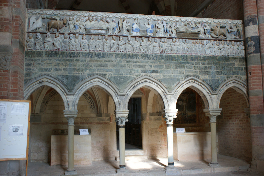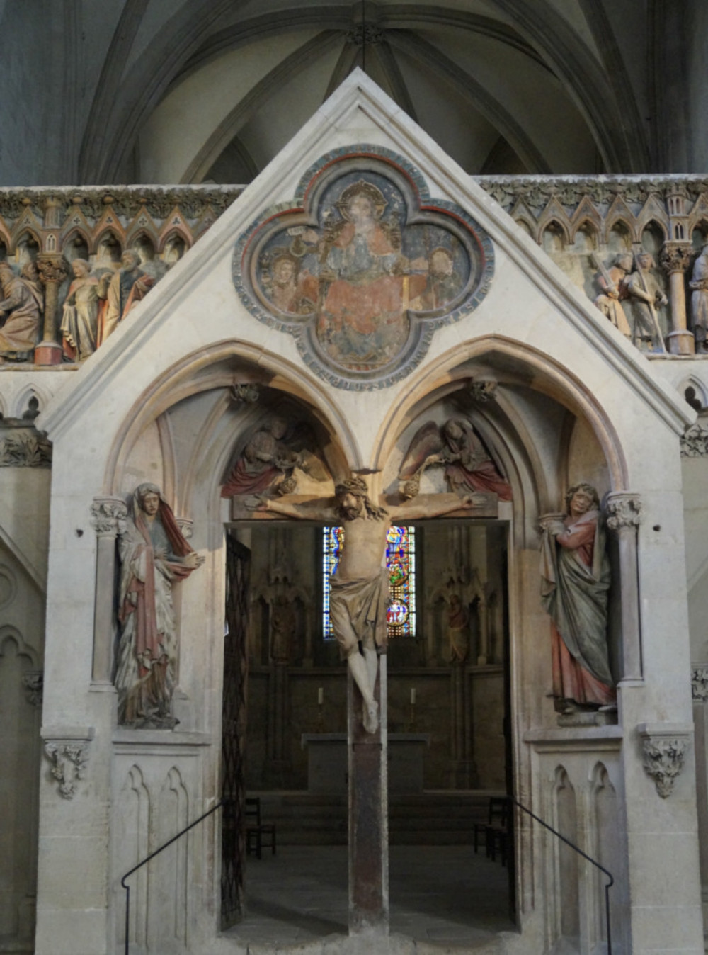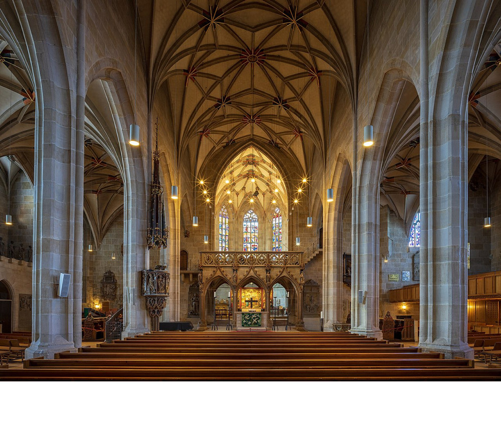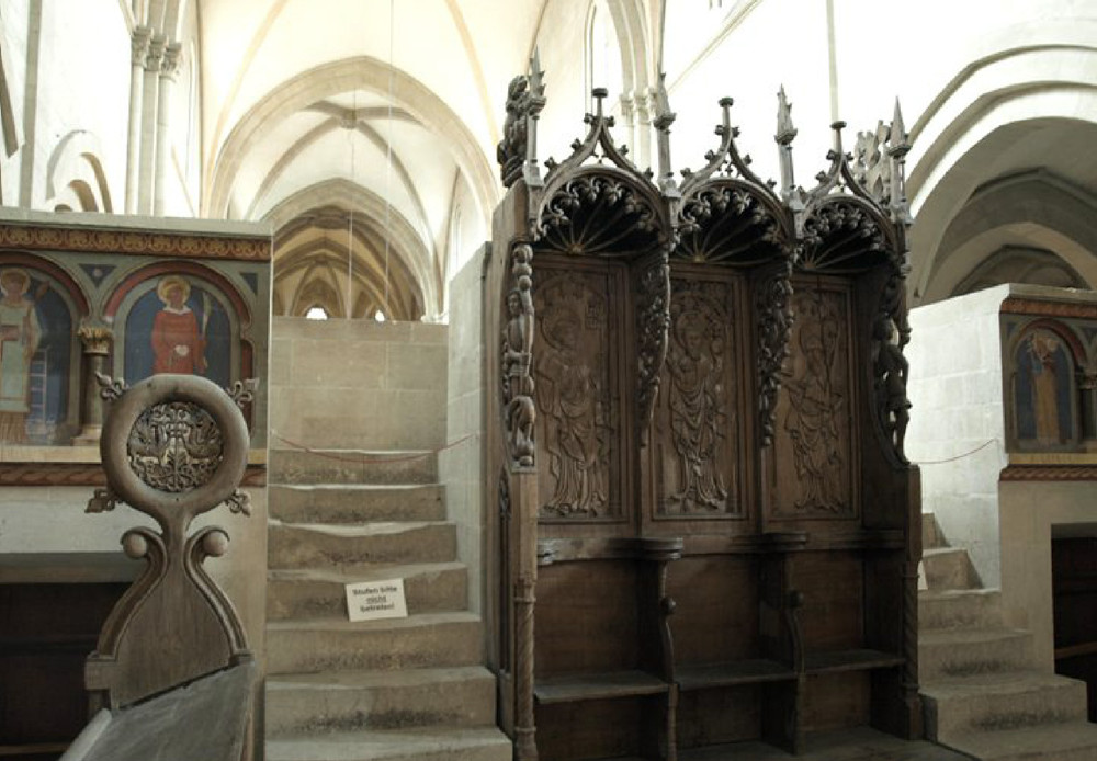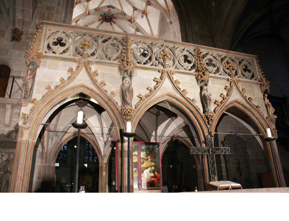 Der Lettner (von lat. lectorium / Lesepult) entwickelte sich seit der Spätromanik als meist gemauerte oder kunstvoll in Stein gearbeitete Wand an der Raumgrenze zwischen Presbyterium und Kirchenschiff. Er lässt sich als eine Weiterentwicklung der frühchristlichen Altar- oder Chorschranken begreifen und trennt den Bereich der Kleriker von dem der Laien (in Klosterkirchen auch den Bereich der Priestermönche von dem der Laienmönche /Konversen). Oft befand sich am Lettner ein Kreuzaltar und der figürliche Schmuck bezog sich auf die Passion Christi. Der Lettner diente zur Verlesung liturgischer Texte, für die Predigt, für mittelalterliche Mysterienspiele oder als Sängerkanzel. Nachdem man sich im Gefolge des Trienter Konzil (1545-1563) im Kirchenraum für den freien Blick auf den Hochaltar bemühte, wurden die Lettner in den katholischen Kirchen weitgehend abgebrochen.
