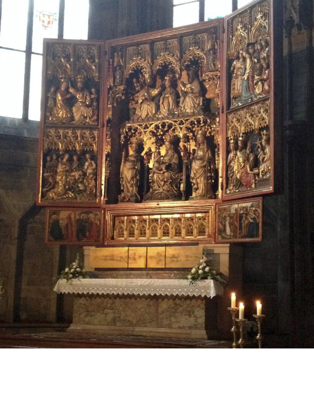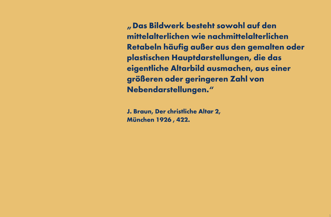 Retabeln wachsen ab der Gotik als Schauwände hinter dem eigentlichen Altar empor, die Orte für Bilder sind. Bald sind es Schreine, die später auch mit beweglichen Flügeln versehen werden. Als Unterbau wird die Predella eingeschoben, während der Aufbau als Malerei oder auch in transparenter Architektur ausgeführt sein kann. Die verschieden bemalten Flügel werden je nach Werk-, Sonn- oder Feiertag auf- oder zugeklappt.