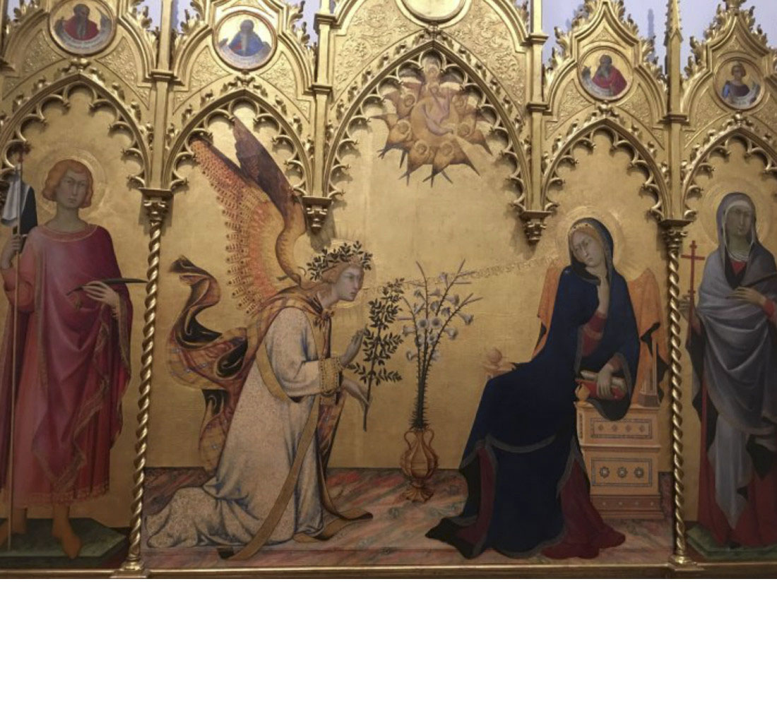 ehem. Altarretabel Sant' Ansano im Dom von Siena Simone Martini (1284-1344)Verkündigung mit den Hl. Ansanus und Maxima, in den Medaillons die Prophten Jersemia, Ezechiel, Jesaja und Daniel, 1333 Uffizien, Florenz