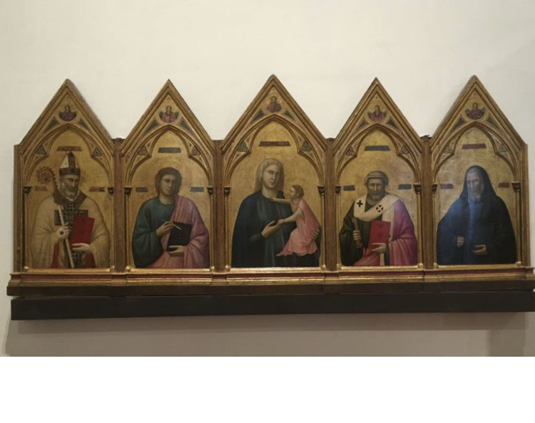 Altarretabel Giotto (ca. 1265-1337) Madonna mit Kind mit den Hll. Nikolaus, Johannes Evangelist, Petrus und Benedikt, 1295-1300 Uffizien, Florenz