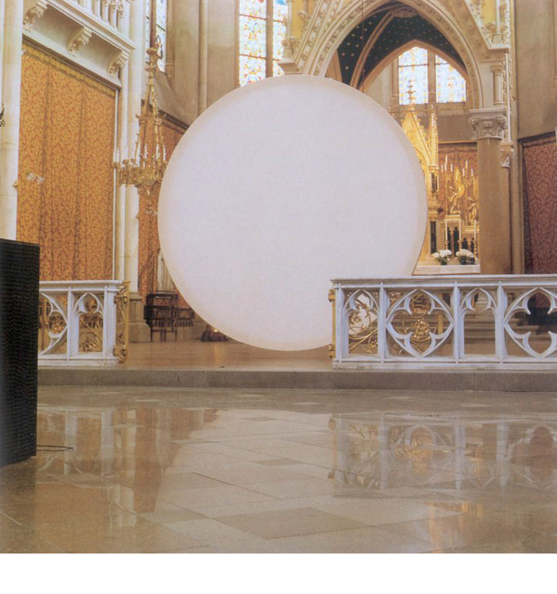 Leo Zogmayer, "Weiße Scheibe" / temporäre Installation in der Grazer Herz-Jesu-Kirche für die Ausstellung "ENTGEGEN", 1997, Gebleichte Schleiernessel auf Holzrahmen, 320 x 6 cm