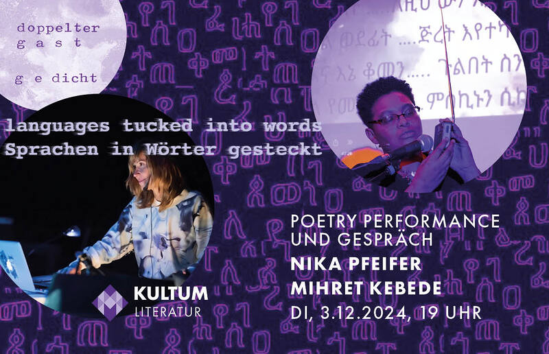 Mit LANGUAGES TUCKED INTO WORDS / SPRACHEN IN WÖRTER GESTECKT vereinen Mihret Kebede und Nika Pfeifer ihre künstlerischen Talente in einer mehrsprachigen Poetry-Performance, die die Grenzen und Möglichkeiten von Sprache erkundet. Ihr gemeinsames Faible für kreative und spielerische Zugänge zu Sprache/n ist der Ausgangspunkt für diesen einzigartigen Abend auf Englisch, Deutsch und Amharisch, eine lebendige Soundscape, die Sprache nicht nur als Kommunikationsmittel, sondern als kunstvolles, musikalisches und poetisches Instrument begreift. Mihret Kebede liest Texte aus Songs We Learn from Trees und Nika Pfeifer aus dem eben frisch im Ritter Verlag erschienenen Band TIGER TOAST.