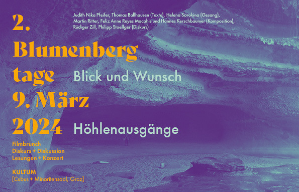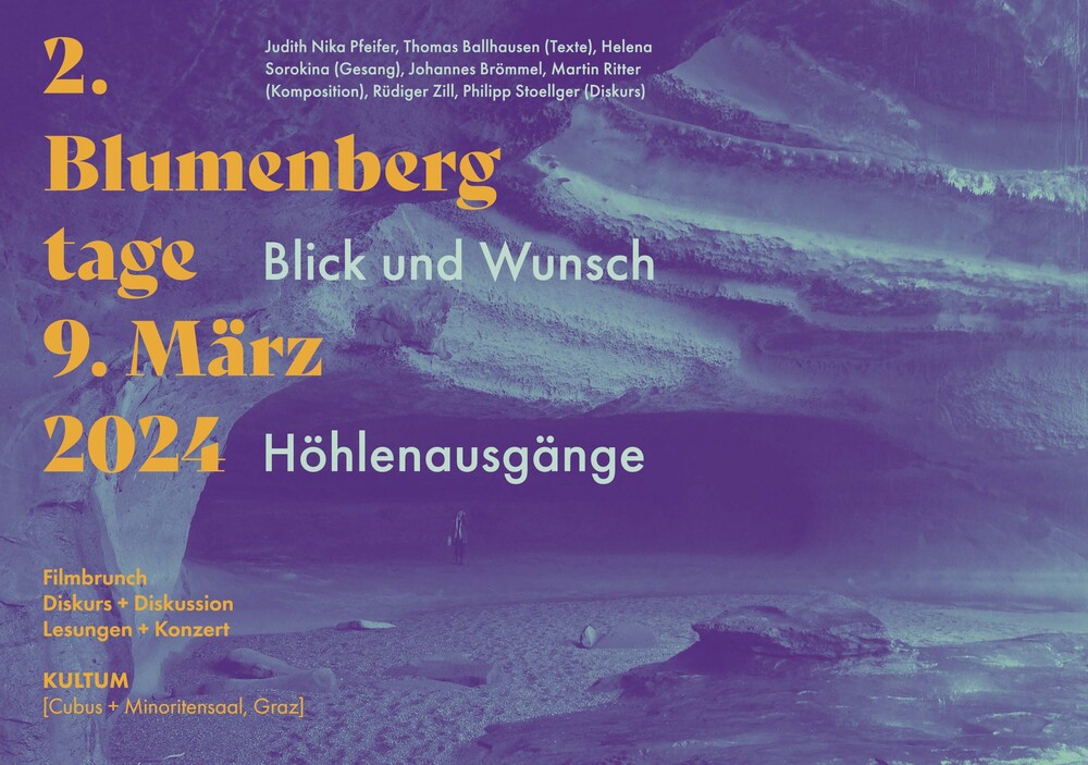 Am 9. März 2024 finden im KULTUM zum zweiten Mal „Blumenbergtage“ statt, in Erinnerung eines der großen Philosophen des 20. Jahrhunderts, der mit seiner Metaphorologie das abendländische philosophische Denken neu vermessen hat. Nach „Unterbringung von Unendlichkeit. Zur Lesbarkeit der Welt“ im Jahr 2022 standen nun mit „Blick und Wunsch“ die „Höhlenausgänge“ im Zentrum des Nachdenkens, des Schreibens, des Komponierens in diesem mehrspartigen Kunstprojekt. Diesem ist ein Filmbrunch über das Werk von Hans Blumenberg vorgeschaltet.