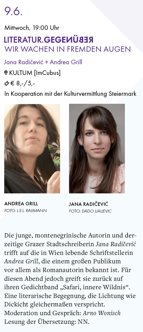 Mit den drei im Juni stattfindenden Lyrikabenden sind bereits zwei Reihen angerissen. Zum einen will die Reihe LITERATUR GEGENÜBER (in Kooperation mit der Kulturvermittlung Steiermark) AutorInnen aus Südost- und Osteuropa und LiterarInnen aus dem deutschsprachigen Raum zusammenbringen, deren Arbeiten thematische oder ästhetische Überschneidungen aufweisen.