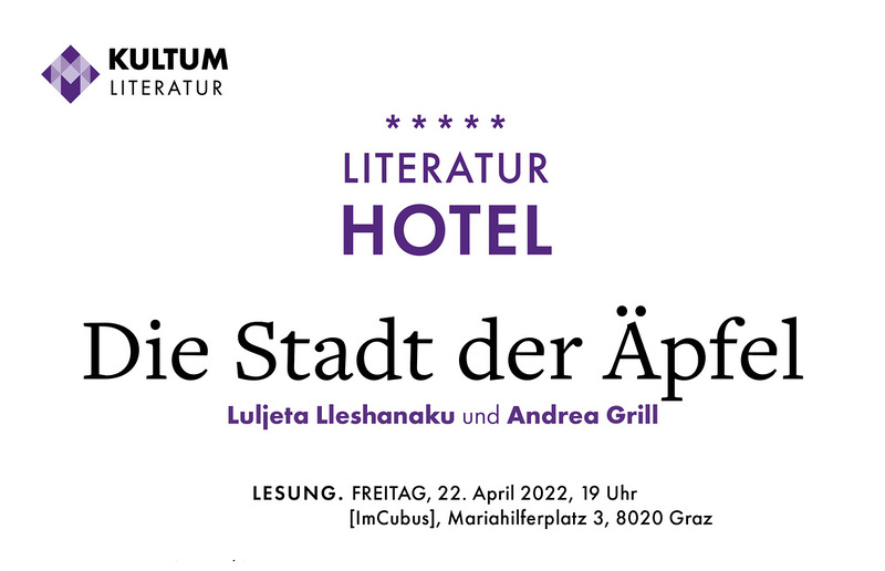 Luljeta Lleshanaku, angereist aus Albanien, bzw. der Schweiz, Andrea Grill (aus Wien) und Julia Cimafiejeva (aus Minsk und derzeit als Stipendiatin der Kulturvermittlung Steiermark in Graz lebend): Sie gestalteten diesen Abend in der Reihe LITERATUR HOTEL im KULTUM. Der Gedichtband, der im Mittelpunkt des Abends stand –„Die Stadt der Äpfel“ – kann durchaus dazu verführen, Äpfel mit Sternen zu vergleichen, wie Kuratorin Barbara Rauchenberger im Begrüßungstext anmerkte. Denn in der Empfehlung (der Band wurde aufgenommen in die Liste der Lyrikempfehlungen für 2022) heißt es: „Luljeta Lleshanaku ist eine der wichtigsten Dichterinnen Albaniens, mehrfach ausgezeichnet und übersetzt. Die Stadt der Äpfel dokumentiert ihre vielseitige Produktion der letzten 20 Jahre. In Andrea Grills Übersetzung begegnet uns eine Zeitgenossin von treffsicherer Spröde, schwankend zwischen Souveränität und Verletzlichkeit, präzise, wort- und bildgewandt.“