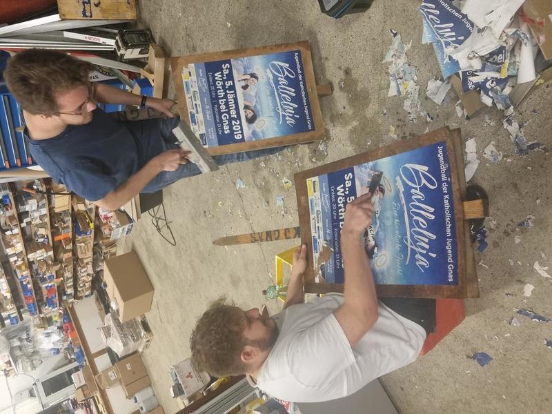 Als erstes mussten dazu alle allen Plakate entfernt werden, damit wir die neuen anbringen konnten. Dies wurde in den Hallen der Firma Günter Niederl GmbH & Co KG gemacht. In weiterer Folge machten wir uns mit zwei Fahrzeugen auf den Weg und stellen unsere Plakate und Banner im Großraum Gnas auf.