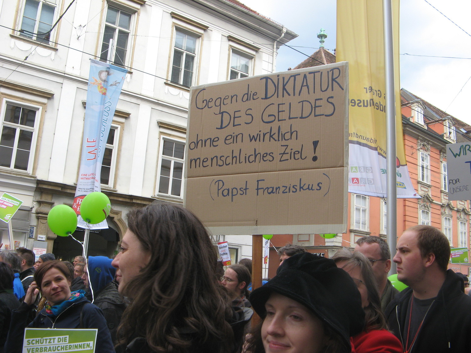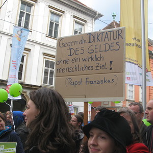 Unter den 1800 TeilnehmerInnen in Graz nahmen auch VertreterInnen der Katholischen Aktion, der Dreikönigsaktion, Welthaus und engagierte ChristInnen an der Demonstration teil. "Gegen den Fetischismus des Geldes und das Diktat der Wirtschaft ohne ein wirklich menschliches Ziel": (Papst Franziskus in Evangelii Gaudium)