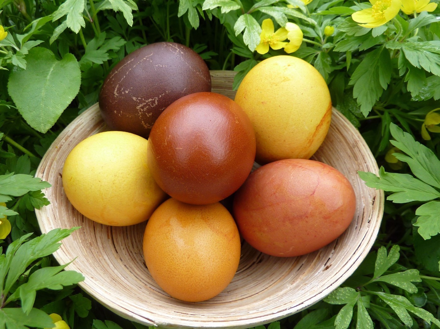 Durch Sprünge gelangt die Eierfarbe oft aufs Ei. Bei Naturfarben ist das kein Problem, diese Farben können Sie einfach mitessen. Von uns bekommen Sie einfache Anleitungen zum Färben und außerdem Rezepte fürs Kochen nach dem Eierpecken. Zwiebelschalen lassen Eier erröten, Curcuma taucht sie in sattes Gelb, Holunderbeeren färben schokobraun und Brennnesseln grün.