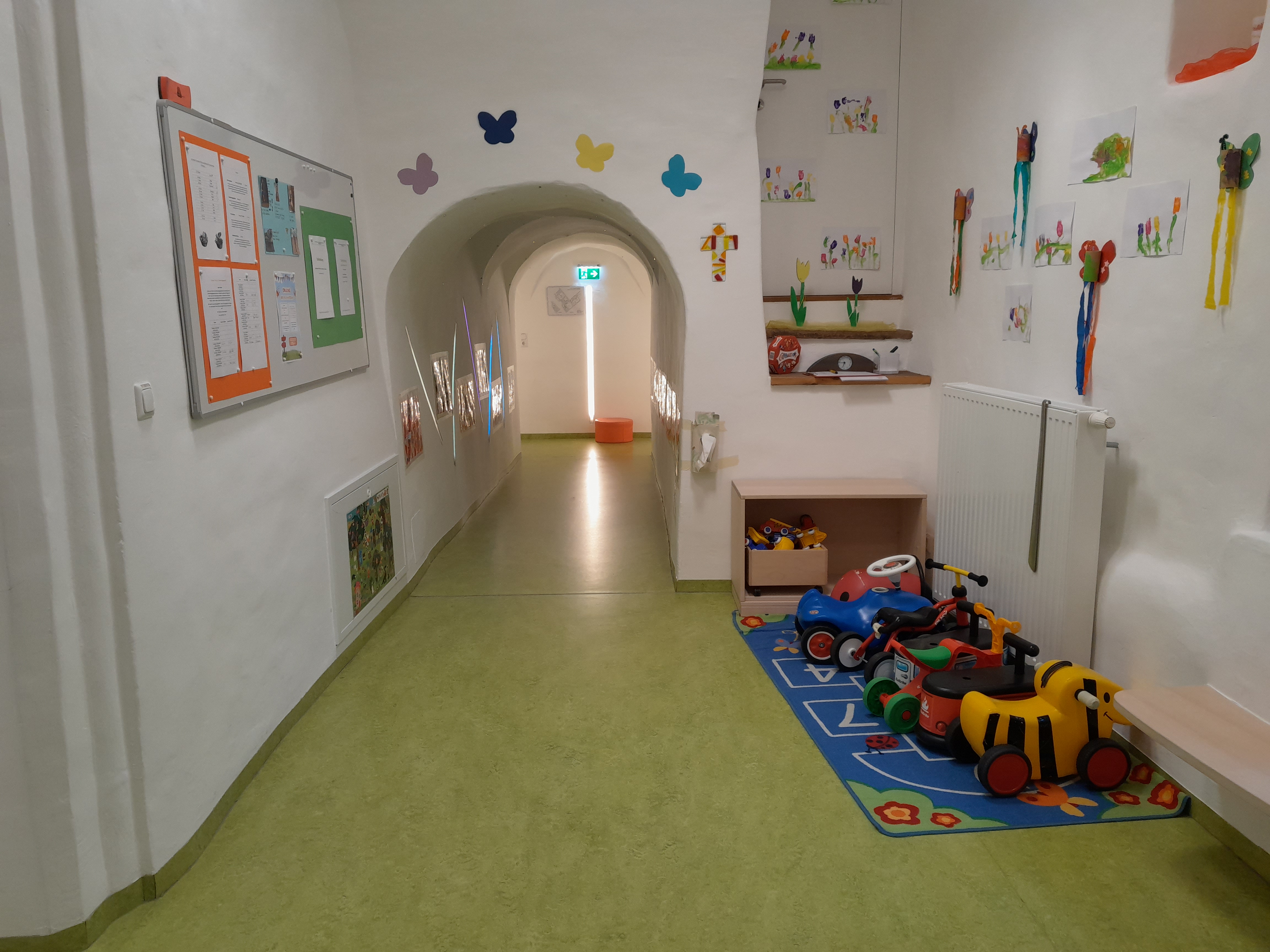 Um ihrem Bewegungsdrang nachzukommen, steht den Kindern zu dieser Zeit der Bewegungsraum zur Verfügung, ebenso können die Kinder am Gang mit den Rutschautos fahren oder mit dem Puppenwagen spazieren gehen.