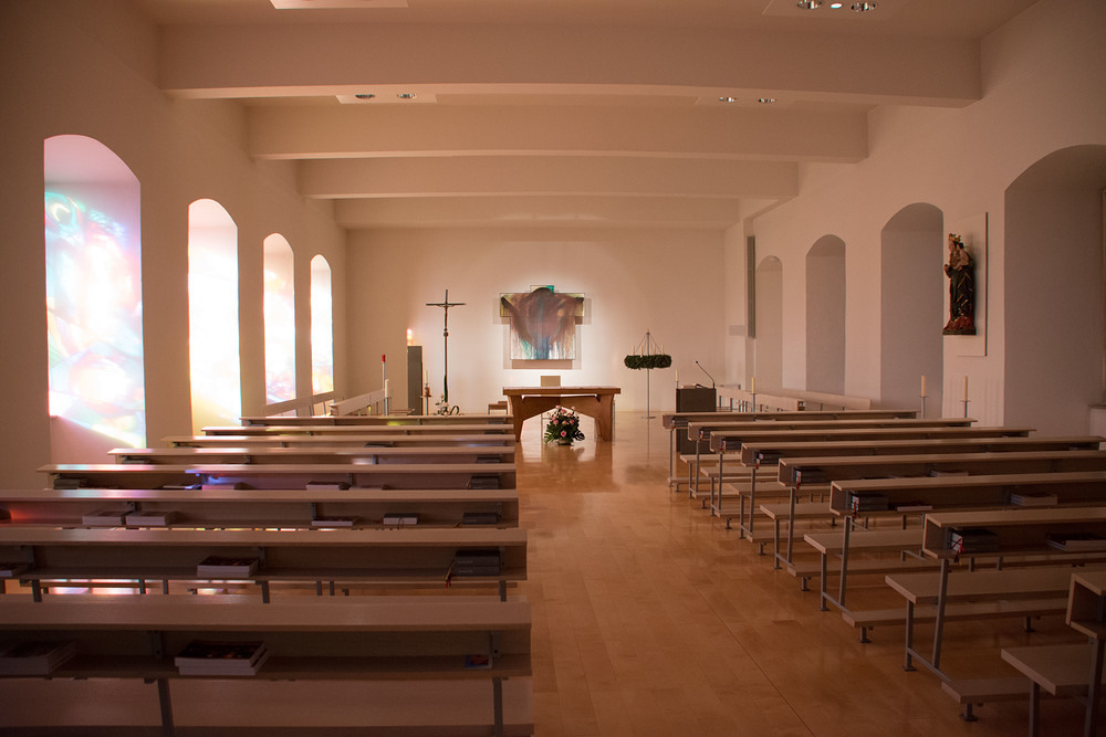 Das glühende Grün vom Bildhintergrund des Kreuzbildes wird fortgeführt in den ostseitigen Glasfenstern Michael Kienzers. Seine Glasskulpturen-Fenster erzählen nichts, stemmen sich gegen die hektische Bilderfülle unseres Medienzeitalters. In mehrere Schichten aus Glas hat Kienzer seine malerischen Gesten eingetragen, in Kommunikation untereinander, aber auch durchlässig für den Aussenraum, der mit lebensvollem Grün am Morgen prägend in den Innenraum tritt. Die Glaswand des Eingangsbereichs setzt den Dialog fort; Kapellenraum und Foyer werden zu spannender Zwiesprache geführt: Der Ort des Gebets und kontemplativer Ruhe existiert nicht abgehoben von unserer Lebenswelt, er wirkt hinaus und unser Alltag in ihn hinein.
