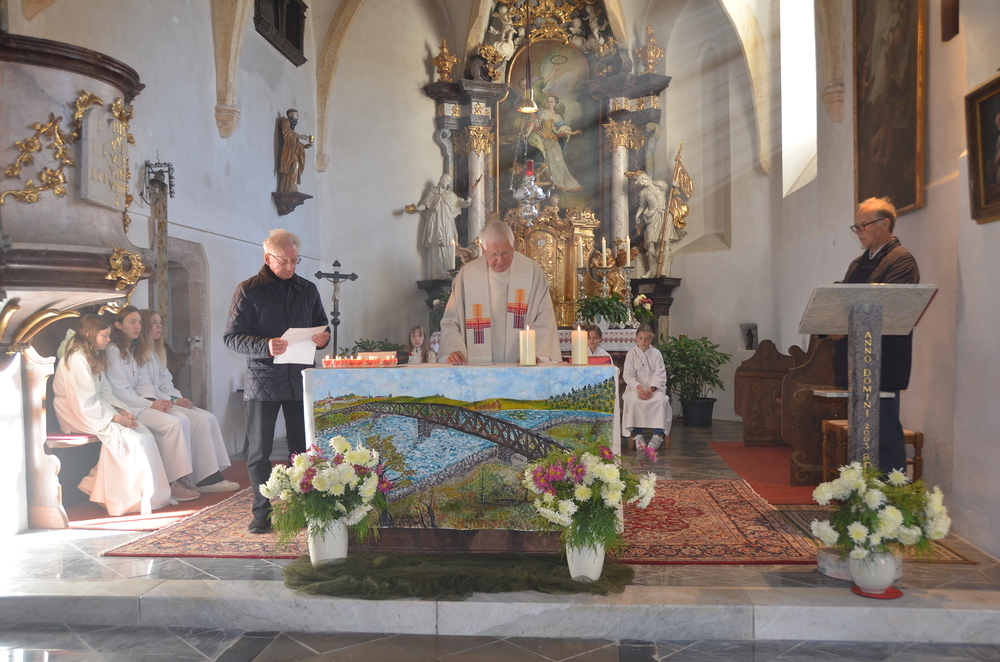 Nach der Predigt wurden die Heiligen, die in der Peggauer Kirche dargestellt sind, angerufen, wobei die Ministranten auf die Heiligenfiguren zeigten.