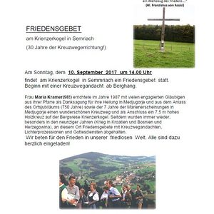 Frau Maria Kramer(98!) errichtete im Jahre 1987 mit vielen engagierten Gläubigen aus ihrer Pfarre als Danksagung für ihre Heilung in Medjugorje und aus dem Anlass des Ortsjubiläums (750 Jahre) sowie der 7 Jahre der Marienerscheinungen in Medjugorje einen wunderschönen Kreuzweg und als Anschluss ein 7,5 m hohes Holzkreuz auf der Bergwiese Krienzerkogel. Seitdem wurden immer wieder, besonders in den neunziger Jahren (Krieg in Kroatien und Bosnien und Herzegowina), an diesem Ort Friedensgebete mit Kreuzwegandachten, Lichterprozessionen und Gottesdiensten abgehalten.