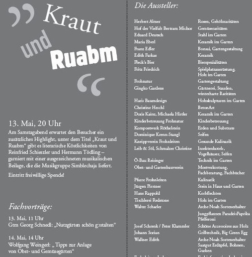 Am Samstagabend erwartet den Besucher ein zusätzliches Highlight, unter dem Titel, „Kraut und Ruabm“ gibt es literarische Köstlichkeiten von Reinfried Schieszler und Hermann Tödling – garniert mit einer ausgezeichneten musikalischen Beilage, die die Musikgruppe Simablechaja liefert.