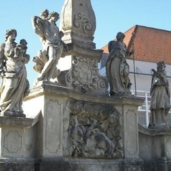 Im unteren Teil sind Sandsteinfiguren des Nährvaters Jesu und Bräutigams der Gottesmutter, Joseph von Nazaret, mit dem Jesuskind im Arm zu sehen, weiters die Pestpatrone Märtyrer Sebastian mit Pfeil durchbohrter Brust und Pilger Rochus von Montpellier mit der Pestbeule am Oberschenkel sowie Johannes Nepomuk mit dem Kruzifix in der Hand, dem in der Kirche ein eigener Altar gewidmet ist. In der Mitte sieht man die heilige Einsiedlerin Rosalia von Palermo in einer Höhle, ebenfalls eine Patronin gegen die Pest, die bis zu ihrem Tode in einer Grotte auf dem Mont Pellegrino lebte.