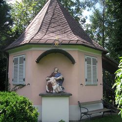 Eines der älteren Bilder unseres Klostergartens ist ein Gemälde im Servitenkloster zu Innsbruck, das die Filiale „Conventum divae V. Assumptae Fronleithi in Styria“, unser Kloster zeigt. Unser Wirtschaftsratsobmann Franz Koiner hat uns Fotos davon gemacht. Leider ist das Bild nicht datiert, das Vorhandensein des Dachreiters schränkt es aber zwischen 1683 (Fertigstellung des Turmes) und 1763 (Brand, nach dem er nicht mehr aufgebaut wurde) ein. Im Hintergrund sieht man die Gartenanlage, wie sie- leicht idealisiert- einem Barockgarten entspricht. Geometrisch angelegte Wege, das Lusthaus im Hintergrund und interessanterweise ein Obstgarten dort, wo jetzt alljährlich das Erntedankfest stattfindet. Wenn man in letzterem Bereich im Boden gräbt, findet man Unmengen von Ziegelschutt, der sicher sekundär dort abgelagert wurde, möglicherweise nach den verheerenden Bränden, die Frohnleiten mehrmals heimgesucht hatten. Ein paar Dinge fallen noch auf: Die Mauer, die den ganzen Garten umgab, später jedoch (siehe Franziszeischer Kataster 1820-1825) nur mehr den Gemüsegarten und das Glashaus in seiner jetzigen Form einschloss. Weiters ist kein Brunnen eingezeichnet, was recht ungewöhnlich ist für eine Zeit, in der Wasserleitungen zur Versorgung noch nicht existierten.