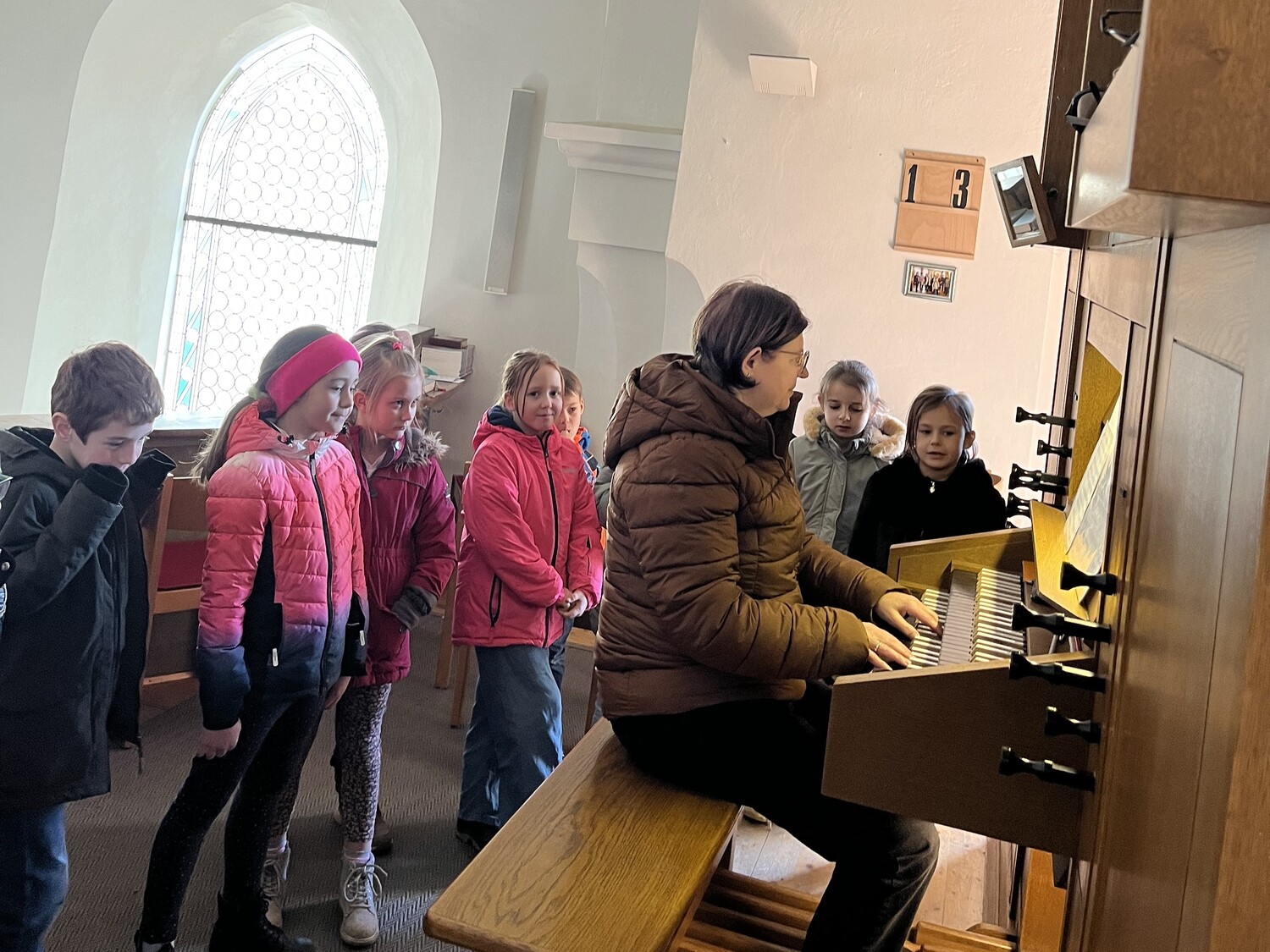 Für die Erstkommunionkinder ist es immer ein spannendes Erlebnis, den Raum der Kirche zu entdecken. Ein großes Danke gebührt unserer Or­ga­nis­tin Brigitte Resch, die den Kindern eine spannende Or­gel­füh­rung er­mö­glich­te.
