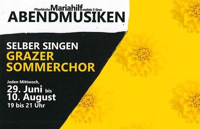 Sommerchor 2022 mit der neuen Chorleiterin Frau Veronika Karner Wolfgang Amadeus Mozart "Krönungsmesse" mit der neuen Chorleiterin FRAU VERONIKA KARNER Proben jeden Mittwoch, 29. Juni bis 10. August 19.00-21.00 Uhr mehr: Sommerchor 2022 mit der neuen Chorleiterin Frau Veronika Karner