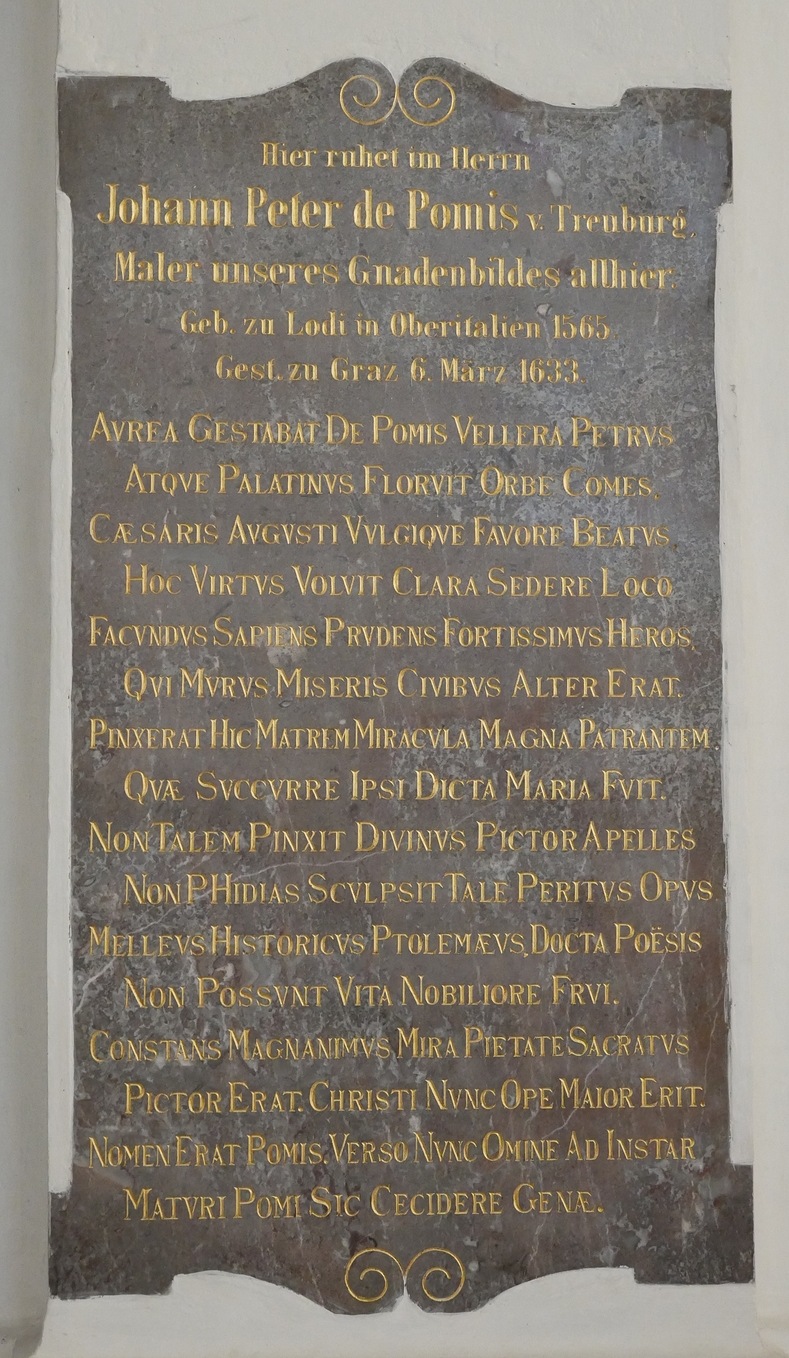 In den südwestlichen Mittelschiffpfeiler ist die Grabplatte für den 1633 verstorbenen Giovanni Pietro de Pomis eingelassen. Das angegebene Geburtsdatum 1565 wird heute in der Forschung eher auf 1569 verlegt. Die Platte weist auf das im Boden befindliche Grab des Malers des Gnadenbildes hin, dem hier an prominenter Stelle der Kirche ein Denkmal gesetzt ist.