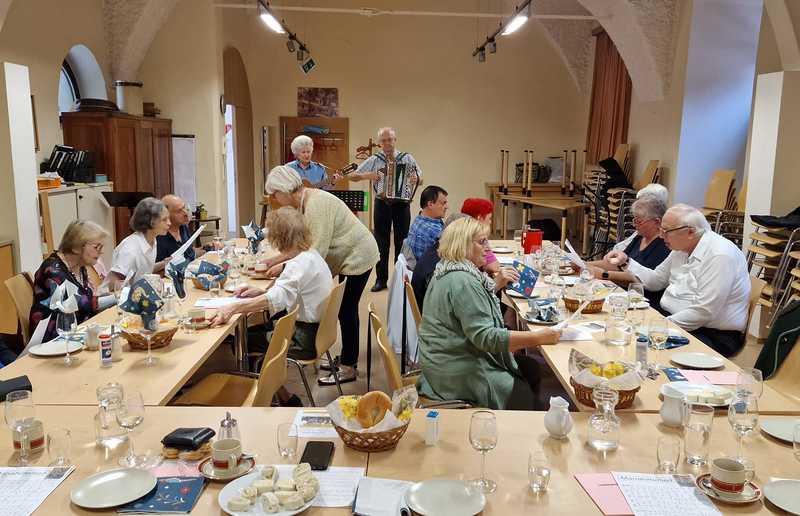 Beim Kaffeetrinken in heiterer Runde werden so manche Lieder gesungen und Feste gefeiert. Geleitet wird unser Seniorentreff von Karl Huber.