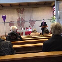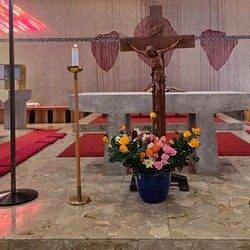 Der Karfreitag wurde in Stille vor dem leergeräumten Altar mit den Zeichenhandlungen der Kreuzverehrung, den großen Fürbitten und der Grablegung begangen. Gestaltet wurde die liturgische Feier von Thomas Possert und einem Ensemble rund um Siegfried Kager.