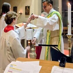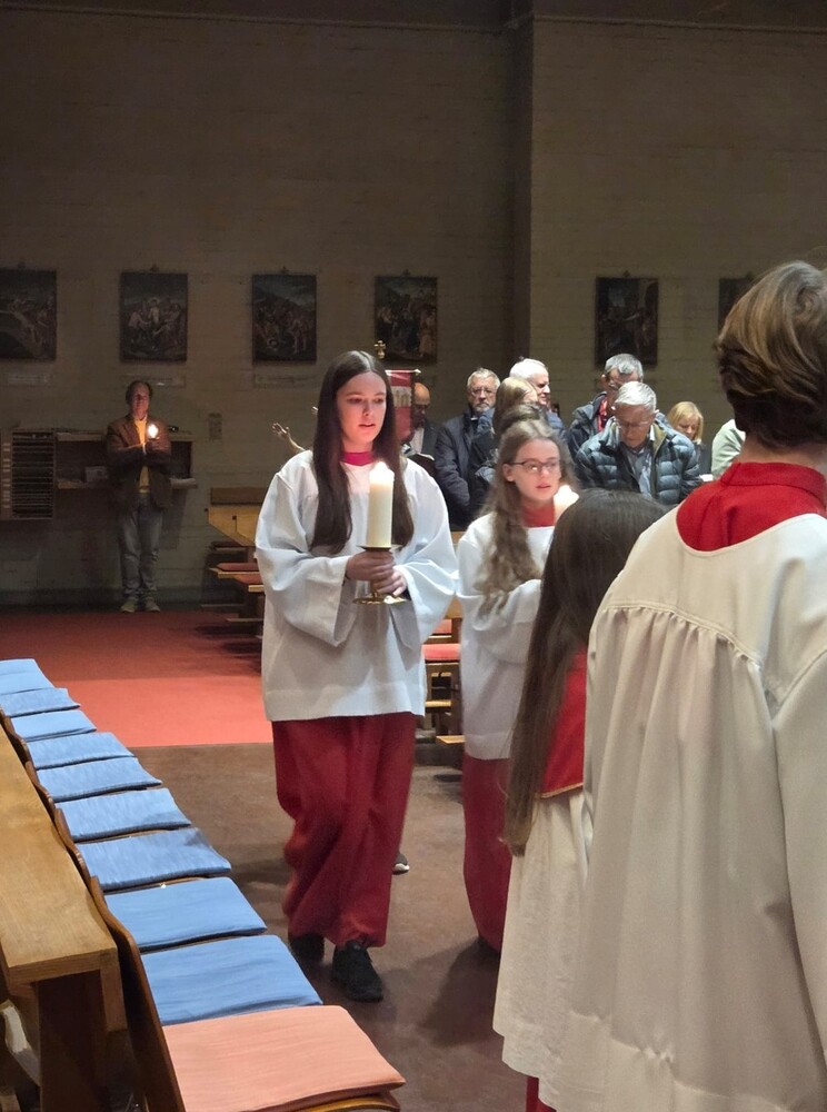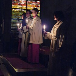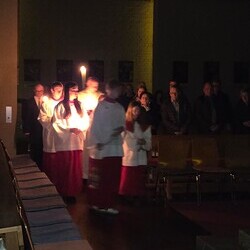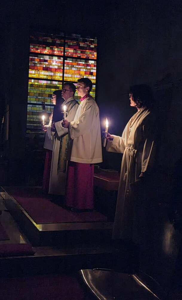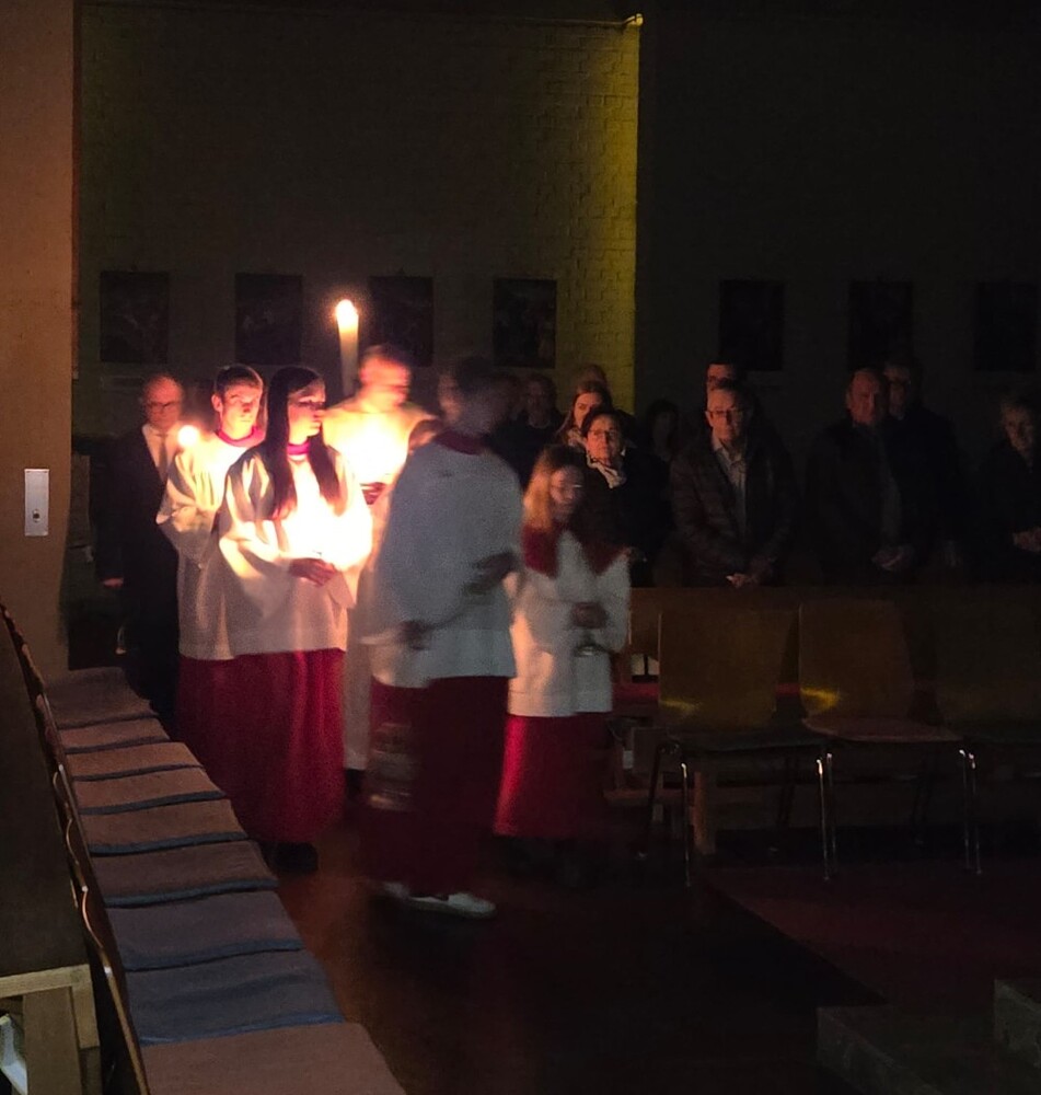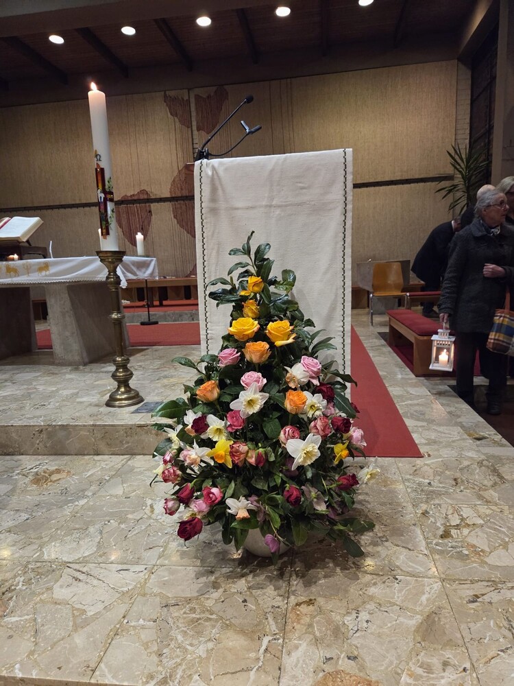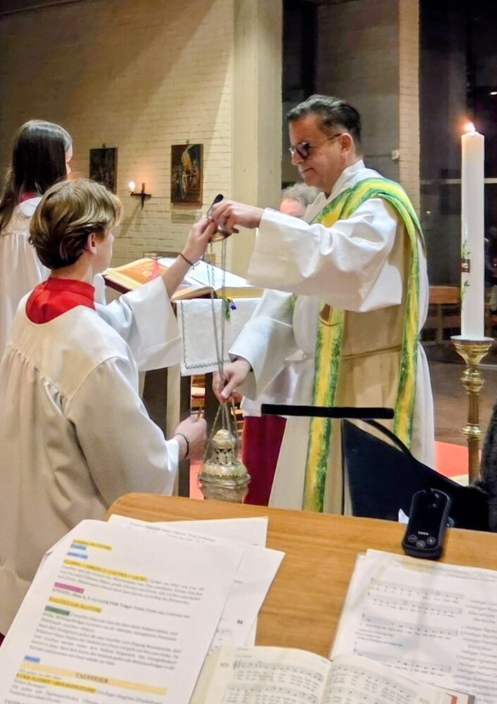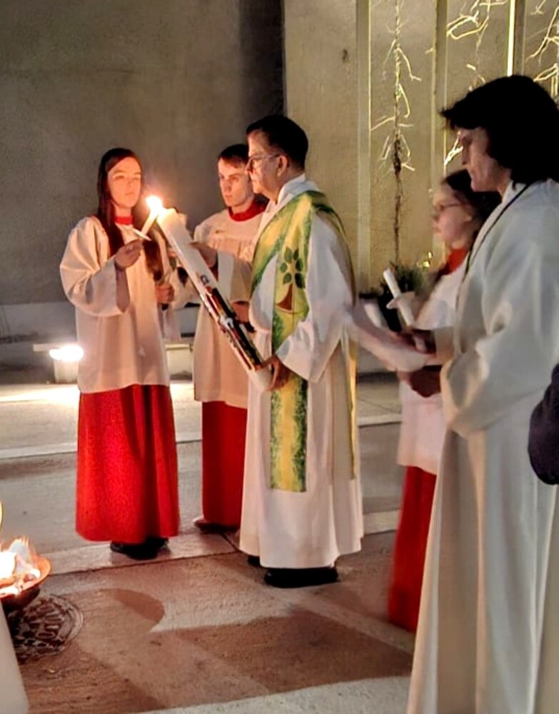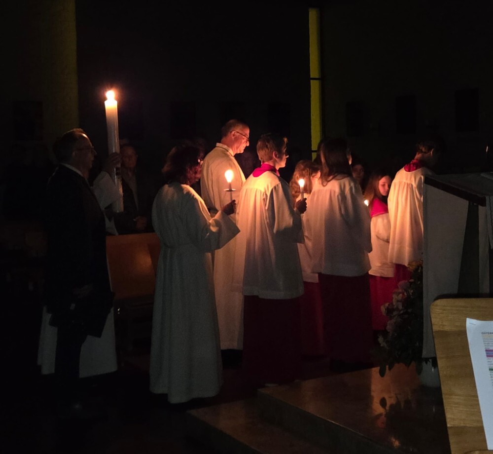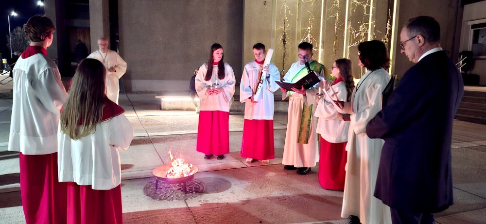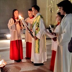 Mit der Feuersegnung am Kirchplatz, danach dem Einzug in die dunkle Kirche mit der Osterkerze und dem Exsultet begann die Lichtfeier. Das Licht wurde weitergegeben an die Gottesdienstbesucher_innen. Bei der Wortgottesfeier kamen beim Gloria die Glocken und das Licht zurück. Das Halleluja tönte, der Weihrauch stieg empor.