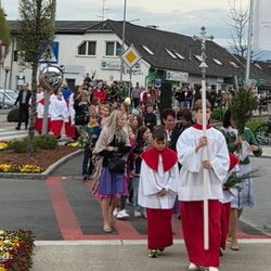Eine Bläsergruppe der Marktmusik umrahmte die Segnung musikalisch. Danach folgten viele der Einladung zur Prozession. Die Kinder gingen mit dem großen Palmbuschen und stellten in der Kirche den Einzug, sowie die kindgerechte Passion mit einfachen Mitteln dar. Ein Ministrant trug stellvertretend für Jesus ein kleines Stück lang das schwere Kreuz, das am Ende mit einem schwarzen Tuch verhüllt wurde.