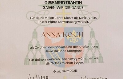 Am 4. Adventsonntag wurde unserer Ministrantenbeauftragten Anna Koch eine besondere Ehre zuteil: Diözesanbischof Dr. Wilhelm Krautwaschl stellte ihr eine Dankesurkunde für ihre langjährigen...