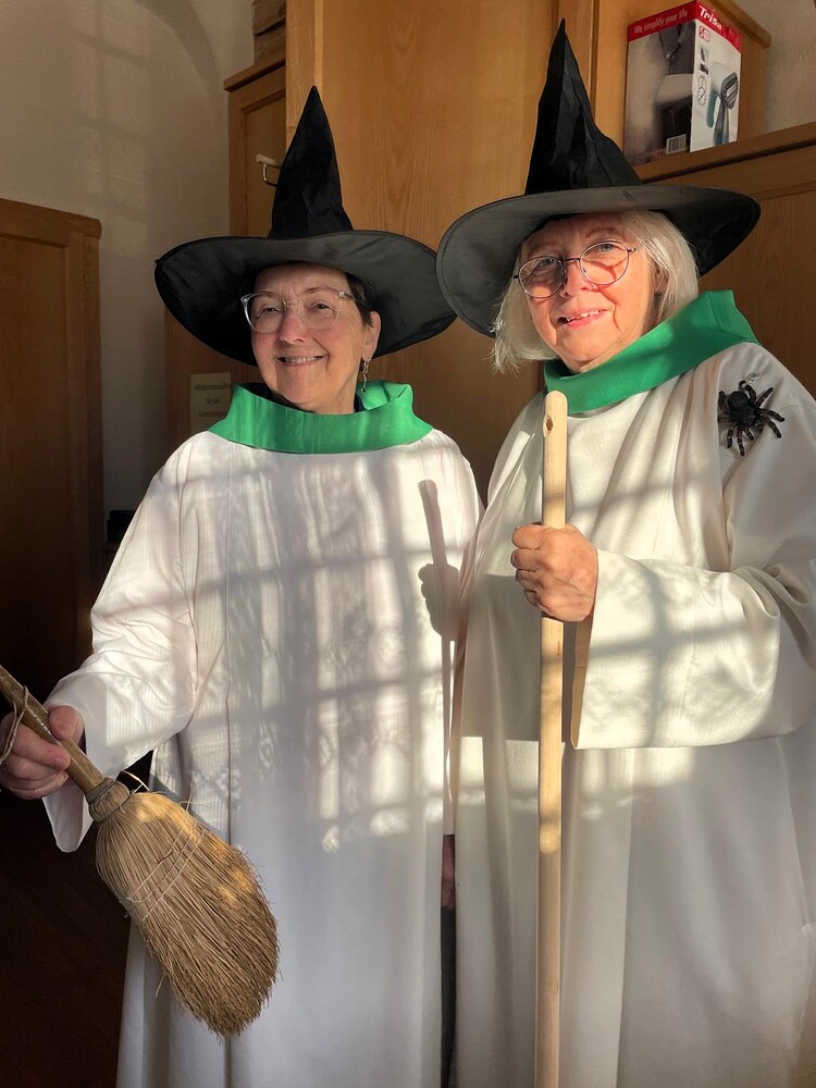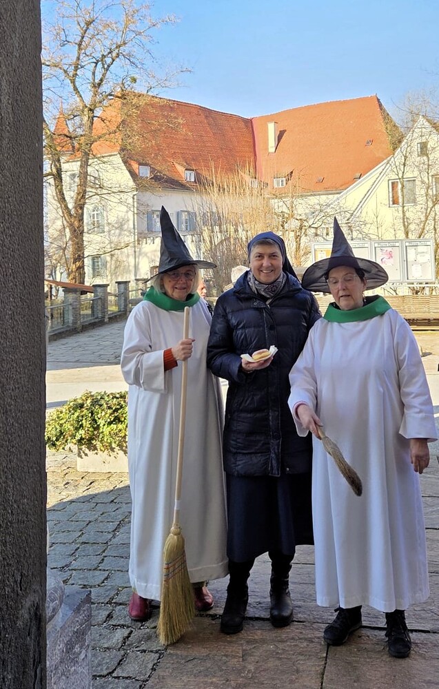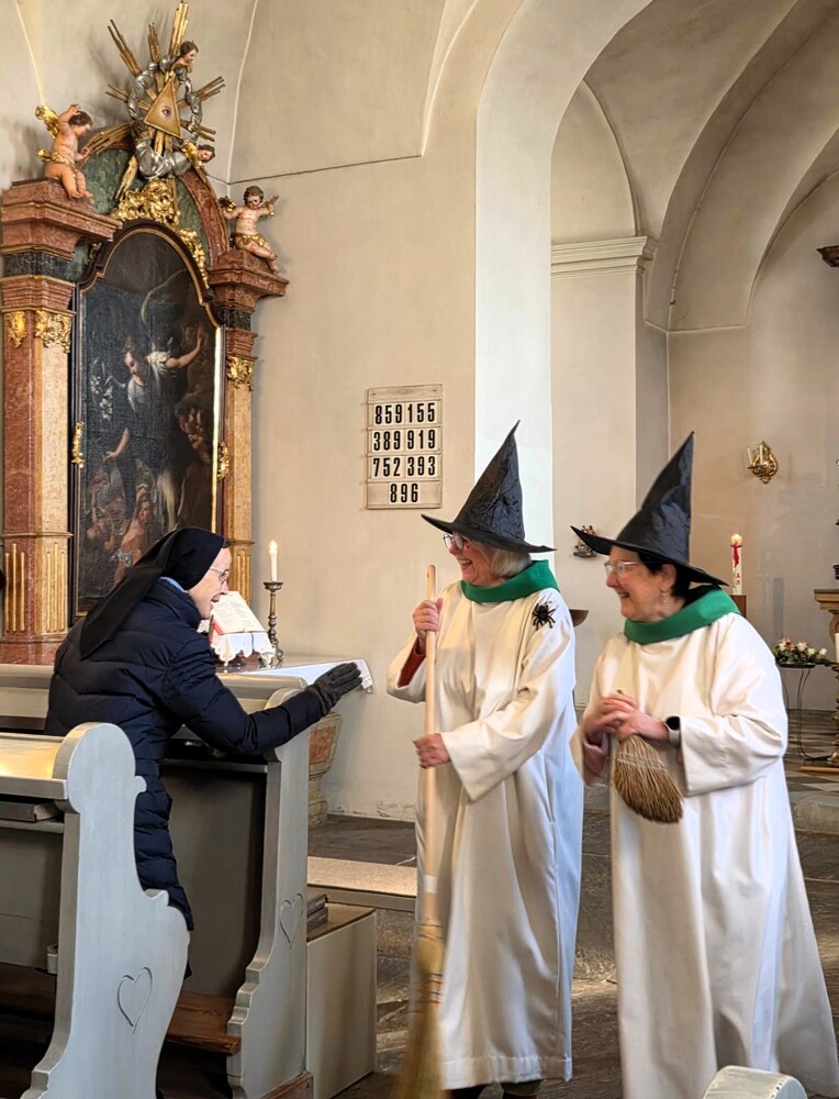 Susanne Linhardt und Margret Hofmann leiteten die heutige Wort-Gottes-Feier am Faschingsonntag in Dobl. “Jeder kehre vor seiner eigenen Tür!“ – die Besen sind gut sichtbar. Fotos sehen Sie weiter unten und auf der Fotogalerie der Pfarre Dobl.