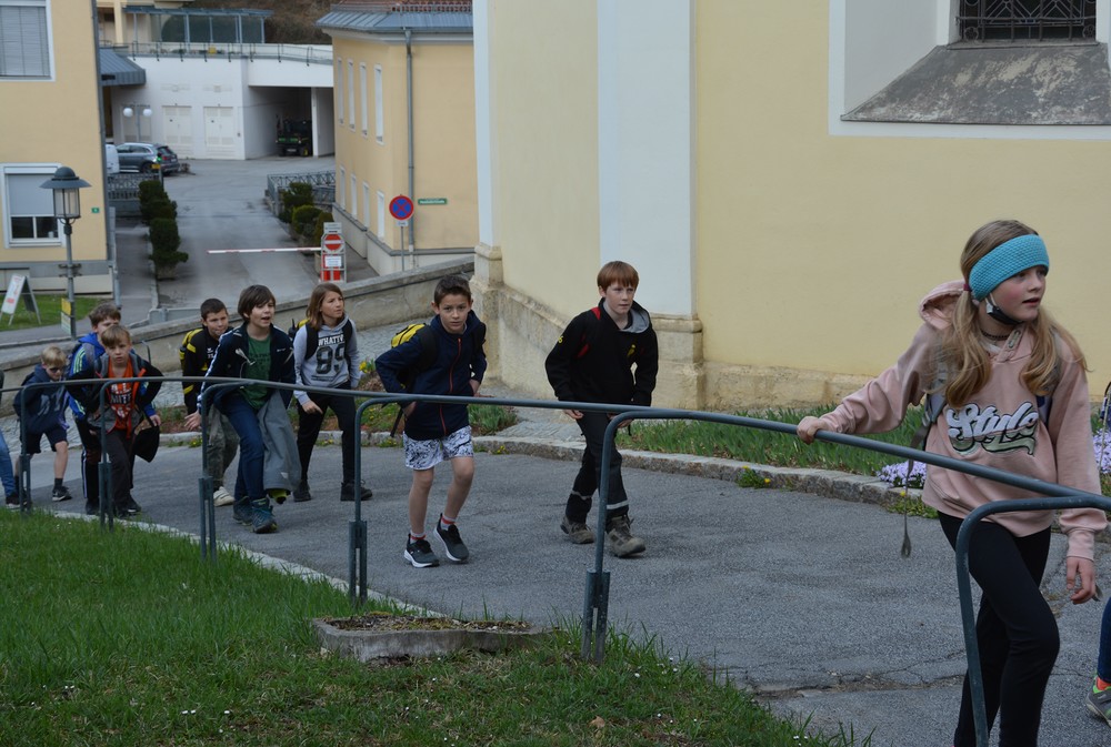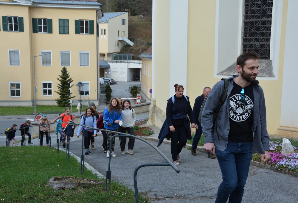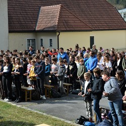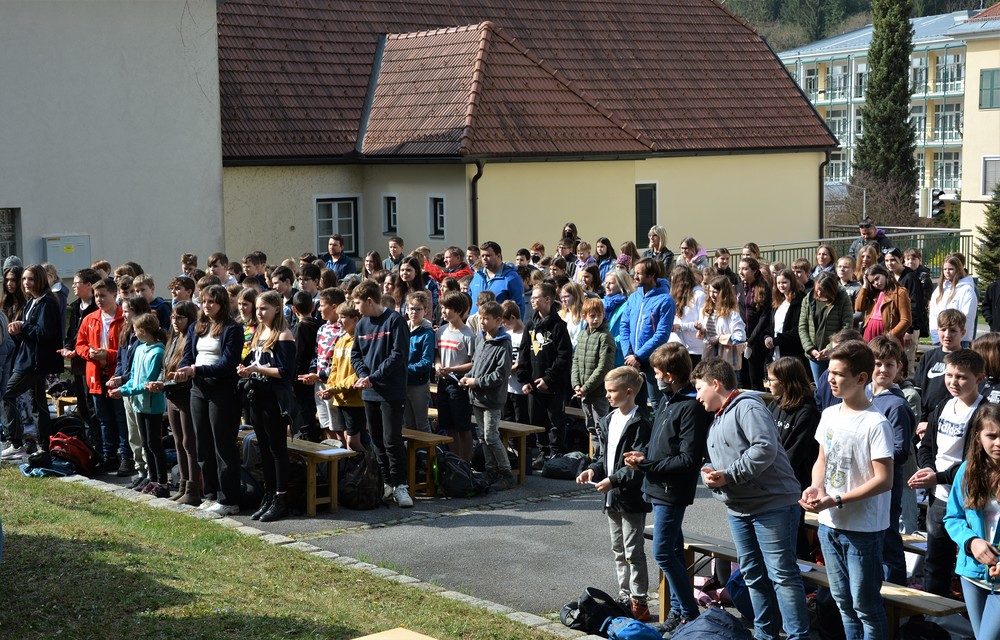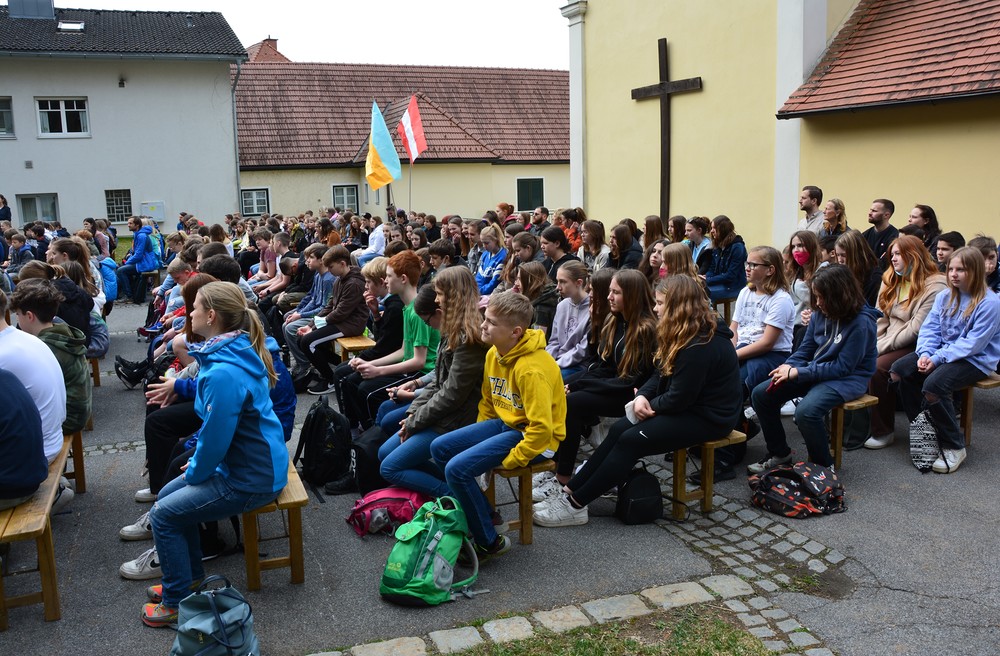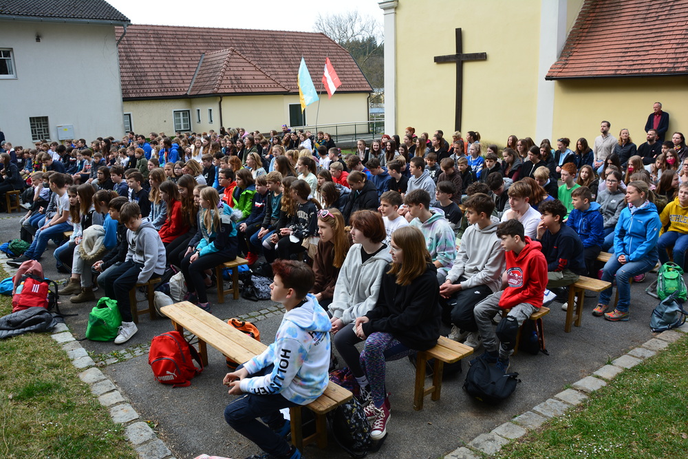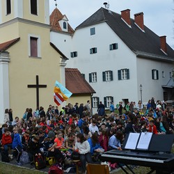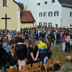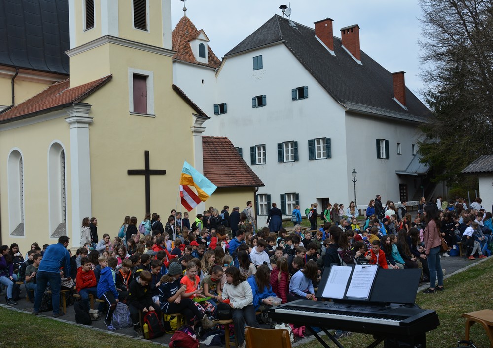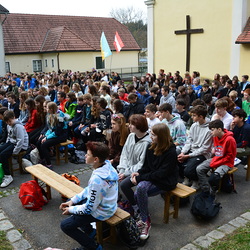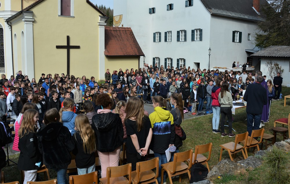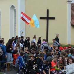 330 Kinder auf unserem Kirchplatz. Sie wallfahren jedes Jahr (Ausnahme Coronazeit) von der Privaten Neuen Mittelschule in Dobl über den Waldweg durch die Johannessiedlung bis zu unserer Pfarrkirche. Viele Schüler:innen kommen aus unserem Pfarrgebiet.