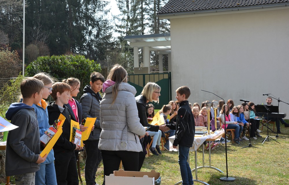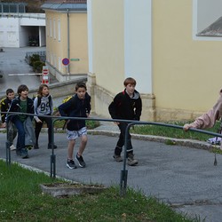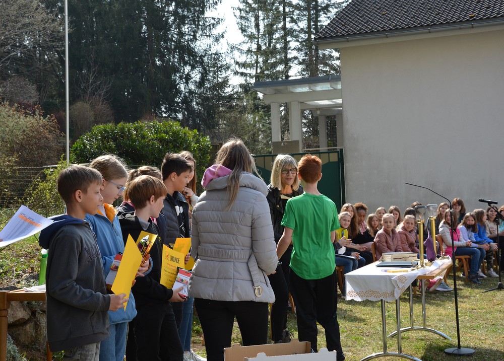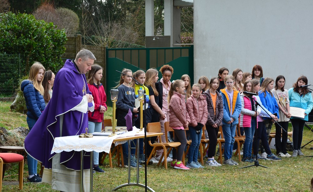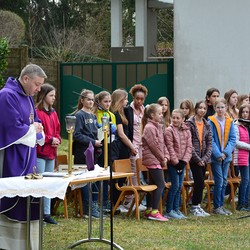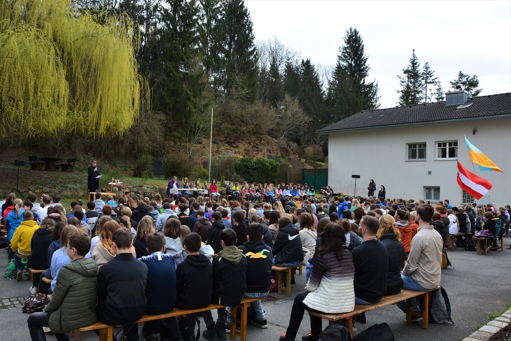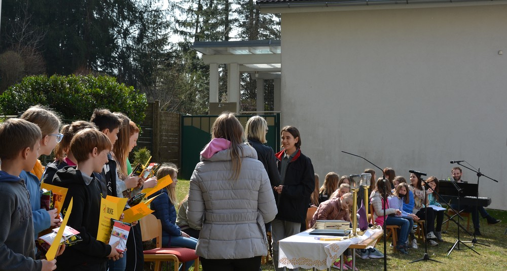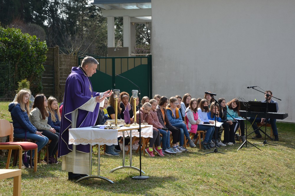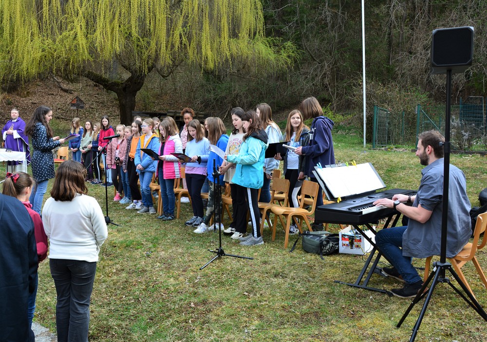 330 Kinder auf unserem Kirchplatz. Sie wallfahren jedes Jahr (Ausnahme Coronazeit) von der Privaten Neuen Mittelschule in Dobl über den Waldweg durch die Johannessiedlung bis zu unserer Pfarrkirche. Viele Schüler:innen kommen aus unserem Pfarrgebiet.