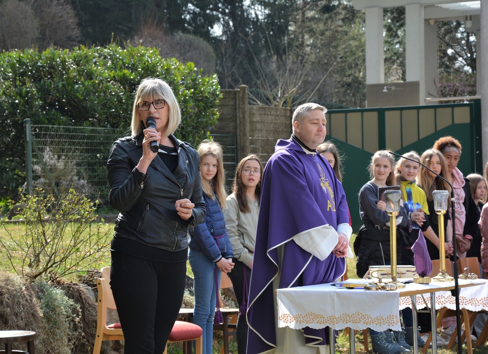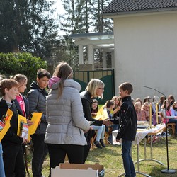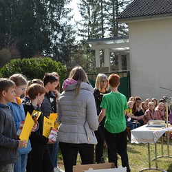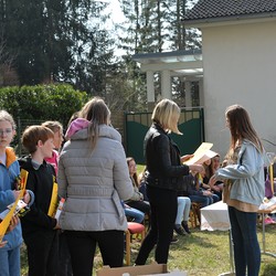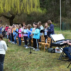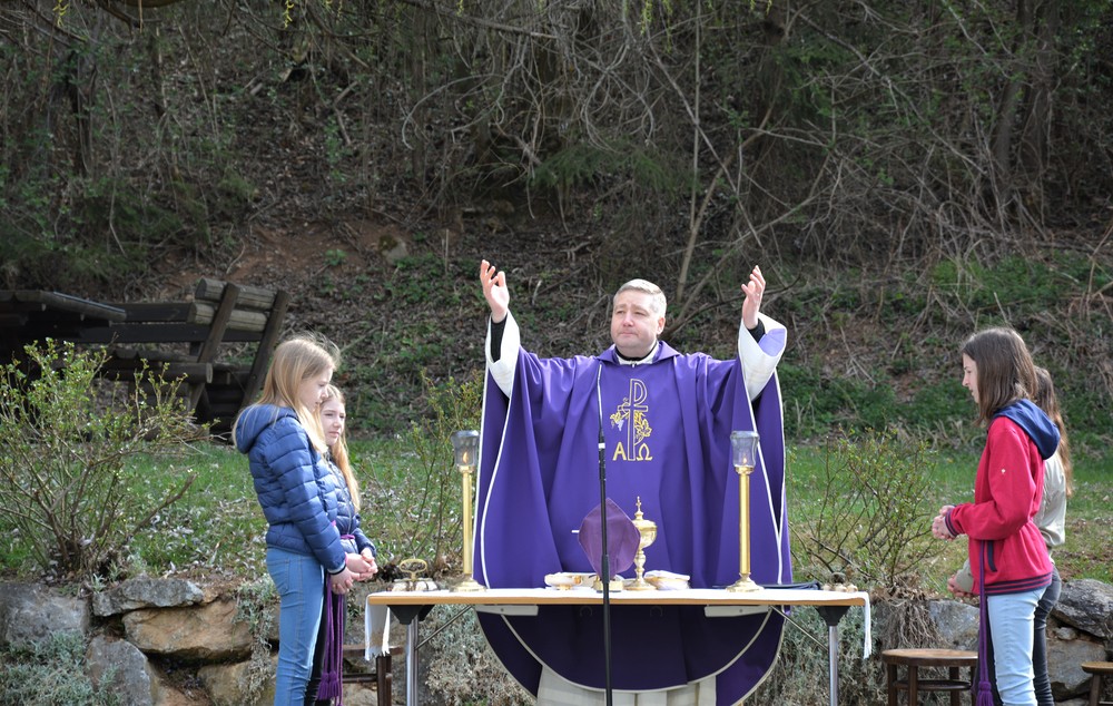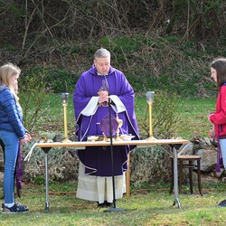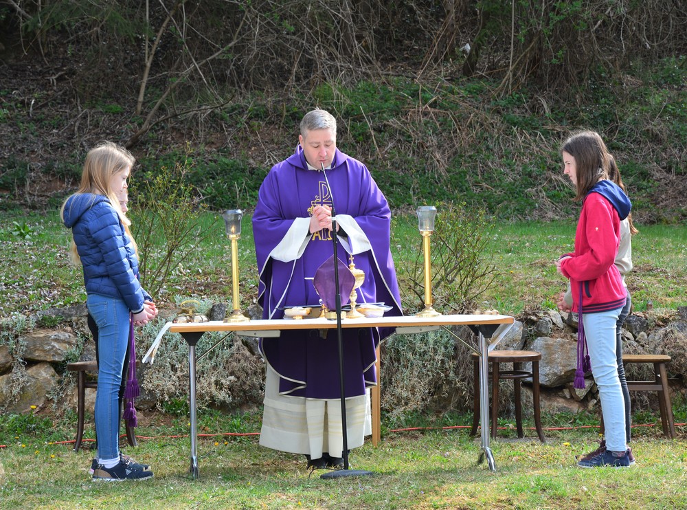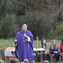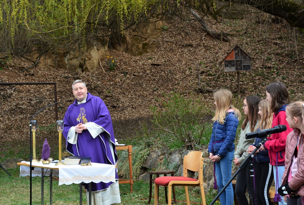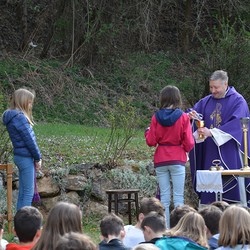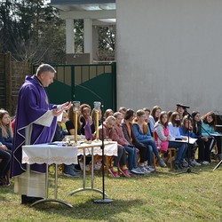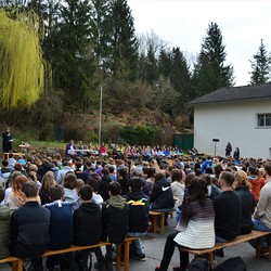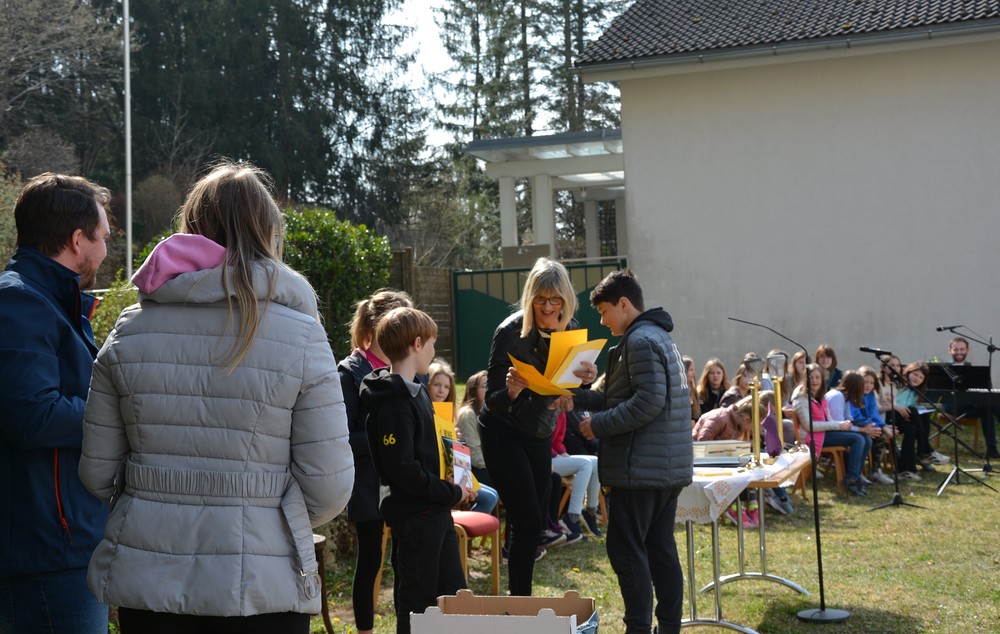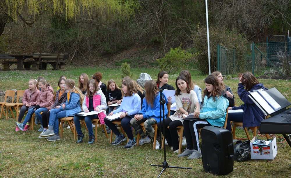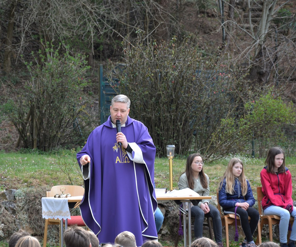 330 Kinder auf unserem Kirchplatz. Sie wallfahren jedes Jahr (Ausnahme Coronazeit) von der Privaten Neuen Mittelschule in Dobl über den Waldweg durch die Johannessiedlung bis zu unserer Pfarrkirche. Viele Schüler:innen kommen aus unserem Pfarrgebiet.