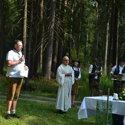 Sonntag, 5. September 2021 - Wortgottesfeier und Segnung des renovierten Waldteufl-Kreuzes im Kaiserwald. Vikar Norbert feierte mit der Familie Schmidt aus Steindorf, die die Renovierung veranlasste, den Jagdhornbläsern und vielen Besuchern aus Nah und Fern.