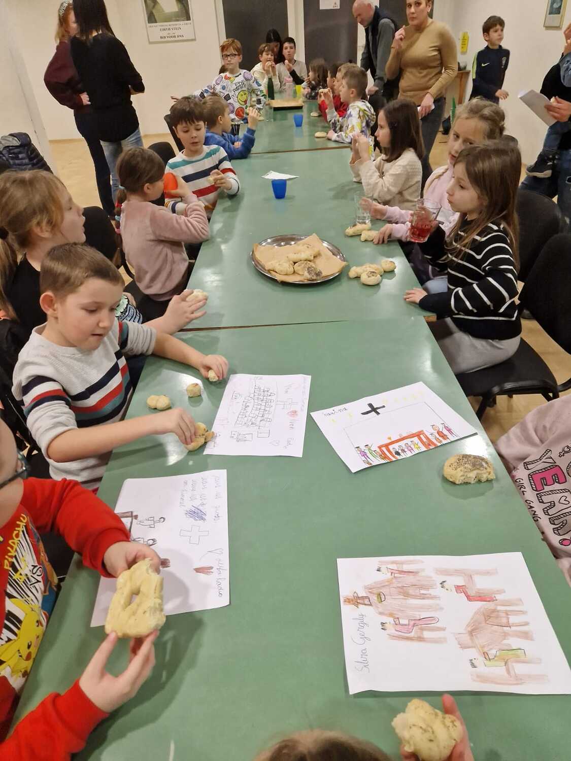 Jeweils an drei Freitagen hintereinander fanden sich in den drei Kapfenberger Pfarren viele motivierte Kinder ein, um köstliche Brot-Weckerln zu backen. Das Formen der Weckerln machte großen Spaß und nach Herzenslust und Geschmack durften diese mit Körnern bestreut werden. Die Backzeit des Brotes wurde mit der Erzählung vom letzten Abendmahl aus einer Kinderbibel überbrückt. Die Kinder sollten anschließend die Szene mit Jesus und den Jüngern am Tisch aus ihrer Fantasie heraus zeichnen.